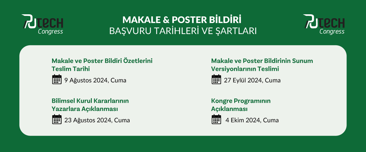 Kongrede sunulacak makale ve posterlerin özetleri, 9 Ağustos 2024 Cuma gününe kadar MS Word formatında e-posta yoluyla, Kongre Sekreteryası’na, info@archive.putechcongress.com adresine gönderilmelidir. Özetler 300 kelimeyi geçmemelidir. Bilimsel Kurulu sunuları kabul veya reddetme, sözlü veya poster sunum seklinde yapılmasına karar verme haklarını saklı tutar.